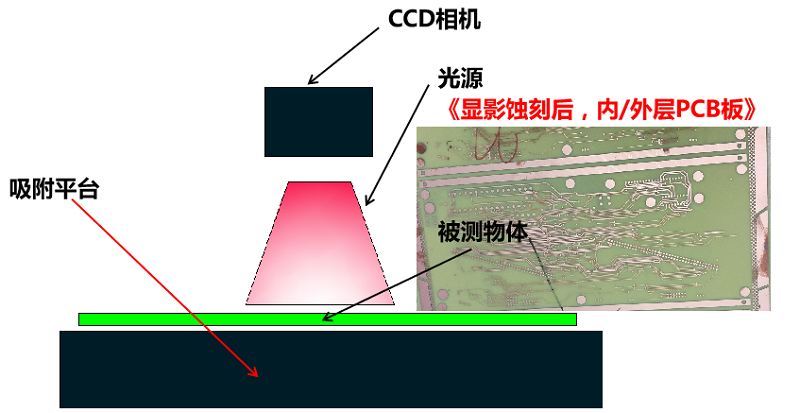 通過影像成像系統(tǒng)及光源從上表面垂直于被測板,呈顯影像(相機(jī)實(shí)時(shí)拍圖)感測,并將圖像傳送至電腦測量軟件,通過軟件測量工具分析圖像的“線寬/線距/線寬上下幅/圓/金手指線寬等”標(biāo)準(zhǔn)公差值對比,從而判斷被測板上的測量值OK或NG。